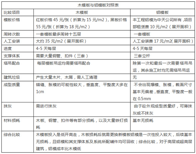 二、铝模工艺优点 1、铝合金模板稳定性好、承载力高、刚度大,拆模后混凝土表面平整光洁。铝模体系整体采用铝合金板组装而成,系统拼装完成后,形成一个整体框架,承载力高达每平方米50KN,抗坍塌性和抗倾覆性提高。 2、铝模板配合CL结构保温一体化、内墙选用ALC板,可以达到施工过程免抹灰,二次结构完成即可开展铝合金、楼地面工程;楼地面完成即可精装修作业,利于流水施工节约工期,并从工艺上消除了空鼓,有效减少开裂。 3、对铝模进行深化设计时,诸多短墙、门垛等二次构件同步设计,与主体混凝土一次性浇筑,不仅加快了施工进度,而且减少了二次结构用工,提高了施工质量。 4、铝模定位准确,结构洞口误差小,主体与砌体完成即具备铝合金安装条件;同时门窗采用净口安装,从工艺上避免了因塞缝不密实导致门窗存在渗漏水的隐患。 5、铝合金模板施工方便、效率高。铝合金建筑模板系统组装简单、方便,每块重量约10Kg,完全由人工拼装,不需要任何机械设备的协助,施工时通常只需要一把扳手或小铁锤,方便快捷,熟练工人每人每天可组装20-30平米。 6、铝模在楼层上的转运基本上靠人工提升,大大提高了塔吊的周转率,从而加快施工进度。 三、铝模施工浇筑砼前,监理工作重点 1、所有模板应清洁且涂有合格脱模剂。 2、确保墙模按放样线安装。 3、检查全部开口处尺寸是否正确并无扭曲变形。 4、检查全部水平模(顶模和梁底模)是水平的。 5、保证板底和梁底支撑杆是垂直的,并且支撑杆没 有垂直方向上的松动。 6、检查墙模和柱模的背楞和斜支撑是否正确。 7、检查对拉螺丝、销子、楔子保持原位且牢固。 8、把剩余材料及其它物件清理出浇筑区。 9、确保悬挂工作平台支撑架可靠固定在混凝土结构上。 四、木模板与铝模板各项指标对比表 木模板与铝模板对照表