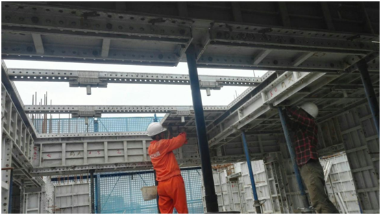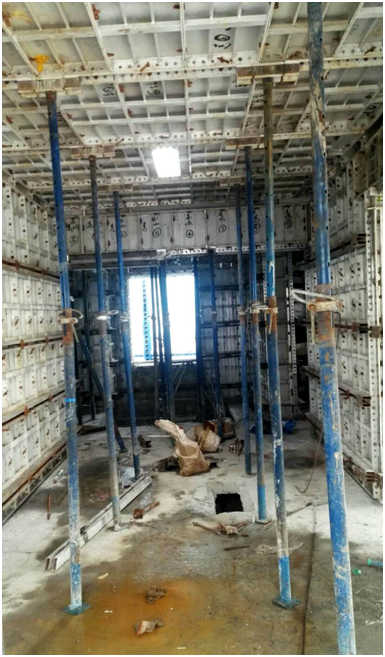 铝模梁板安装,中间镂空部位为传料口,方便铝模拆除后从传料口人工往上传递。与传统木模比较,不用卸料平台、不需要用塔吊吊运模板,进而加大塔吊的周转率,加快施工进度。(每块铝模重约10KG)