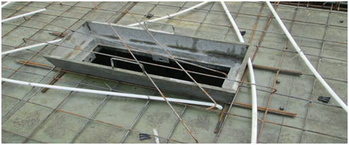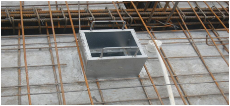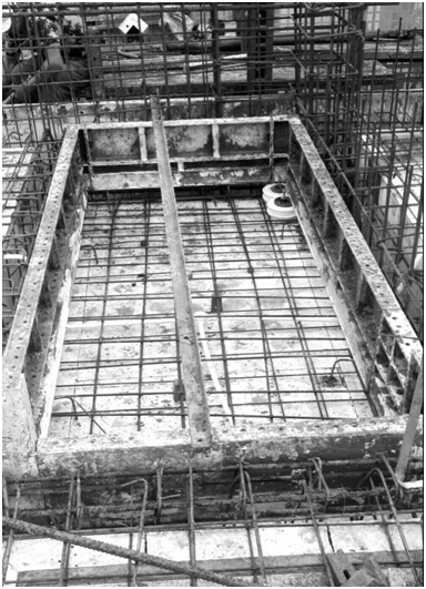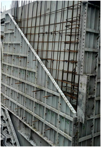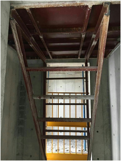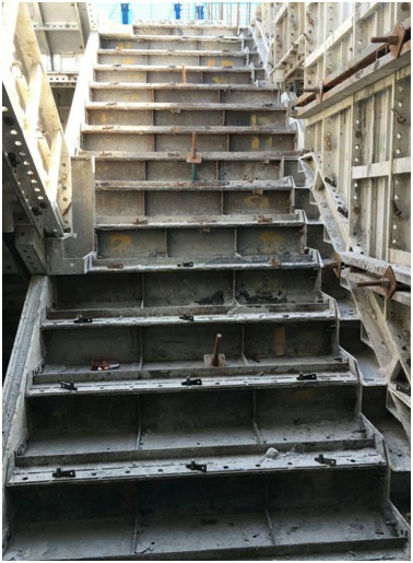 梯间踏步铝模安装。该部位砼浇筑时,震动棒斜插入踏步铝模内进行振捣。踏步铝模上有排气孔,砼振捣时,便于气体排除,提高砼质量