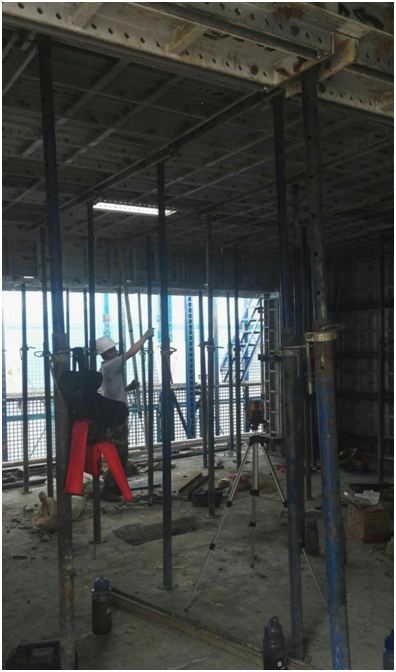 工人调节立杆,通过中间部位调节螺母调节立杆高度,确保其有效支撑,用塔尺检测立杆垂直度。本工程通过计算,采用独立杆支撑能确保其稳固性